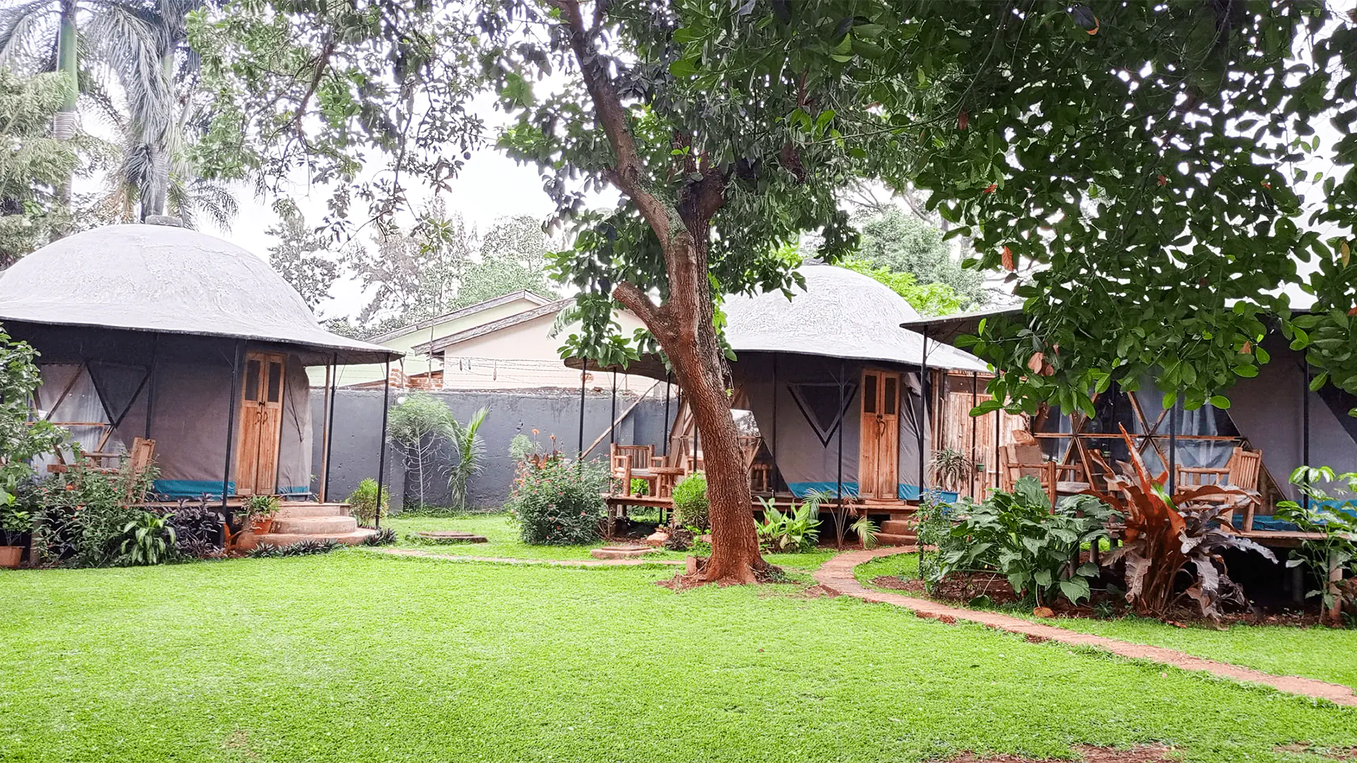 Eco Geodesic-Dome-Tents with huge garden area, spacious living area, comfy beds, A/c, Coffee and Tea station, power point, bed switch, spacious semi outdoor en-suite Bathroom with sink, indoor plants, toilet, towels, soaps and sun roof for more light, Veranda with Garden view.